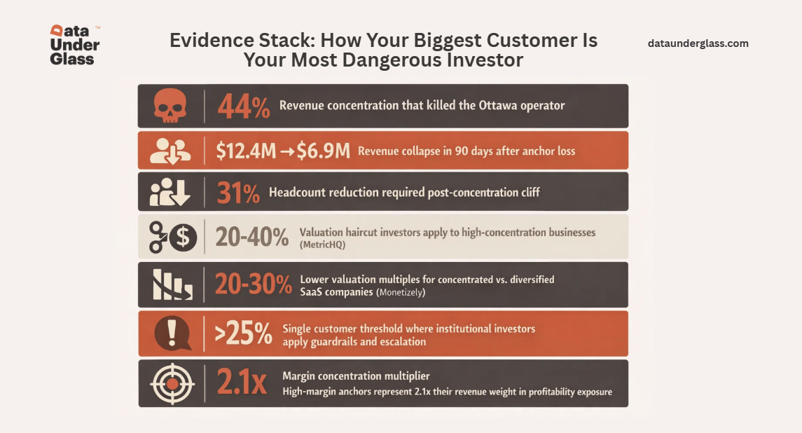 Case in Point: Two years ago, an Ottawa enterprise data compliance SaaS at $12.4M ARR had rationalized 44% revenue concentration in one Canadian federal agency because "government contracts don't disappear." The model showed multi-year stability, predictable renewals, and a clear path to $28M ARR. Leadership positioned the anchor as proof of product-market fit.